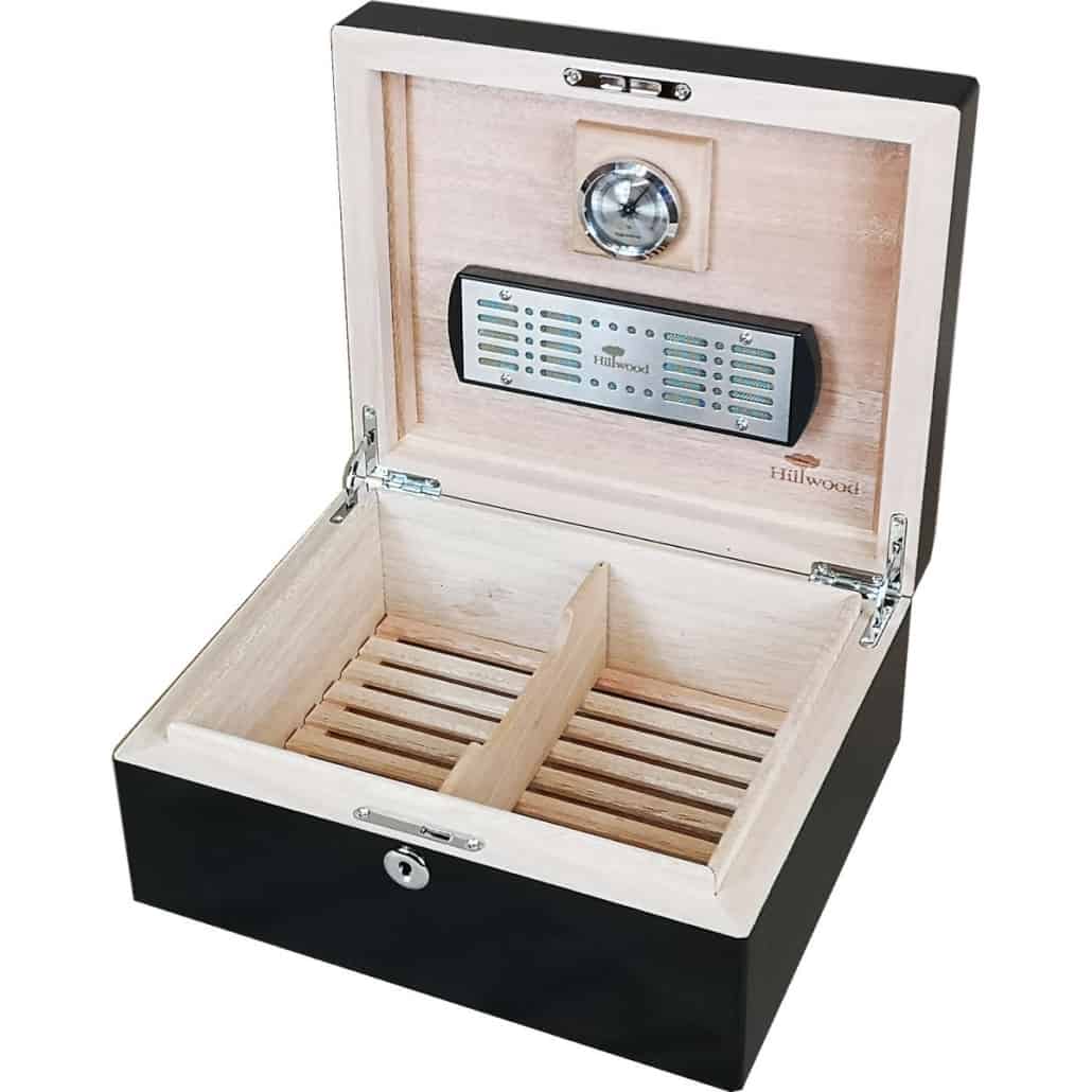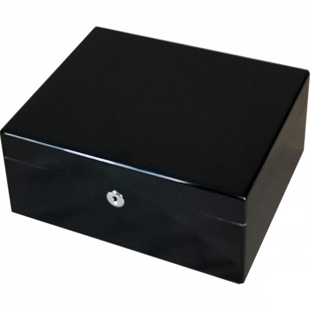 This 25-30 cigar humidor is made from the finest high gloss Piano Black gloss lacquer. It has 15 coats of gloss lacquer giving it a high gloss finish. The interior is lined in cedar. It is fitted with a Hillwood chrome hygrometer and humidifier system for perfect cigar storage. It has a removable divider to keep cigars separate and accommodate different sizes as well as a key lock to keep it closed and secure. The base is fitted with a removable wooden frame to enable uniform airflow around the cigars in the bottom of the box. Brand new and in a gift presentation box this humidor will be great for personal use or as a gift.